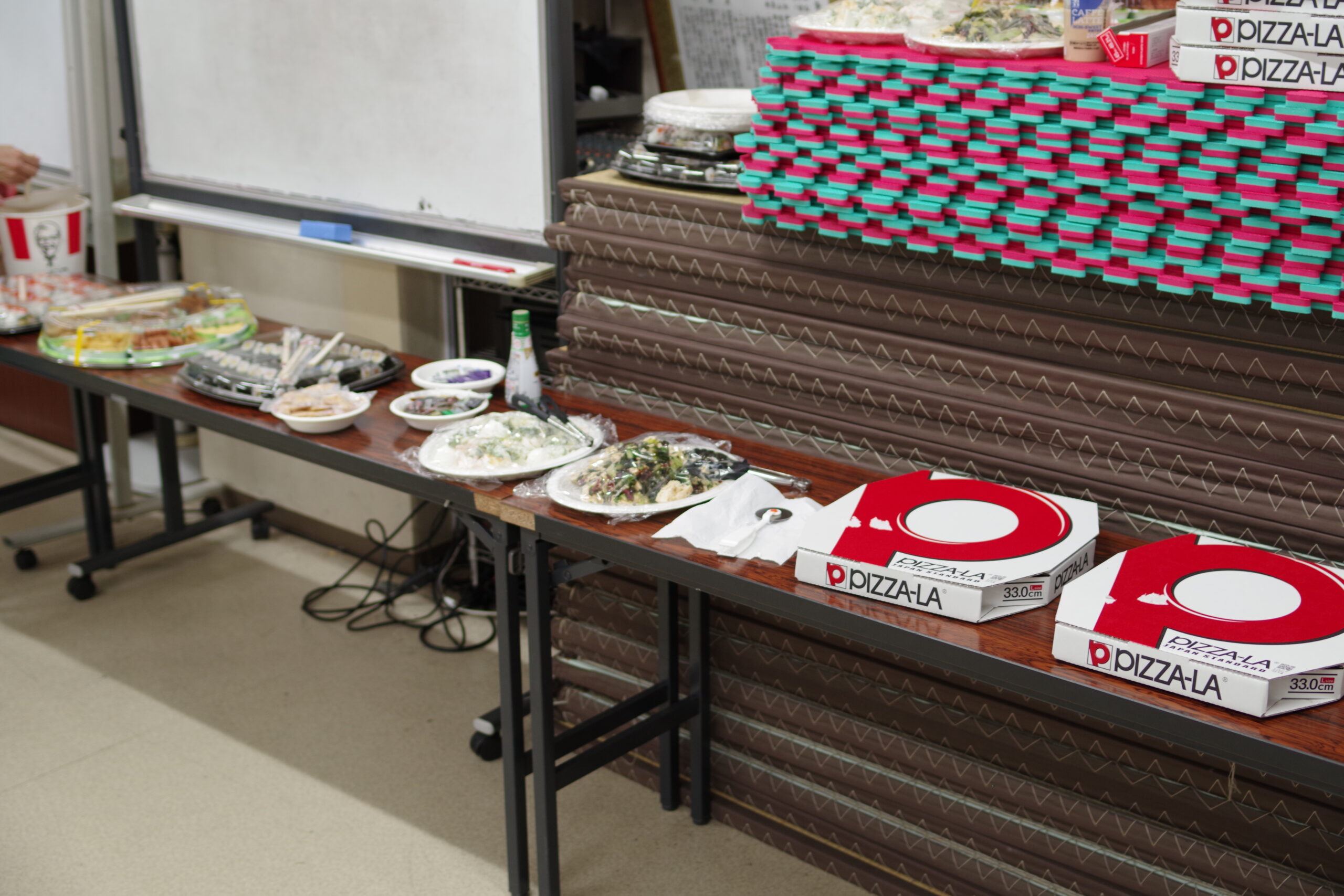 当日は講師で買い出しをしたのですが、ついつい沢山買ってしまいました。「遠慮することなく食べてほしい」と思ってしまうんですよね、、、(笑)この写真の3倍は食事はありました。(最後に余った食事やお菓子は全員でちゃんと持って帰りました(^^♪ )
